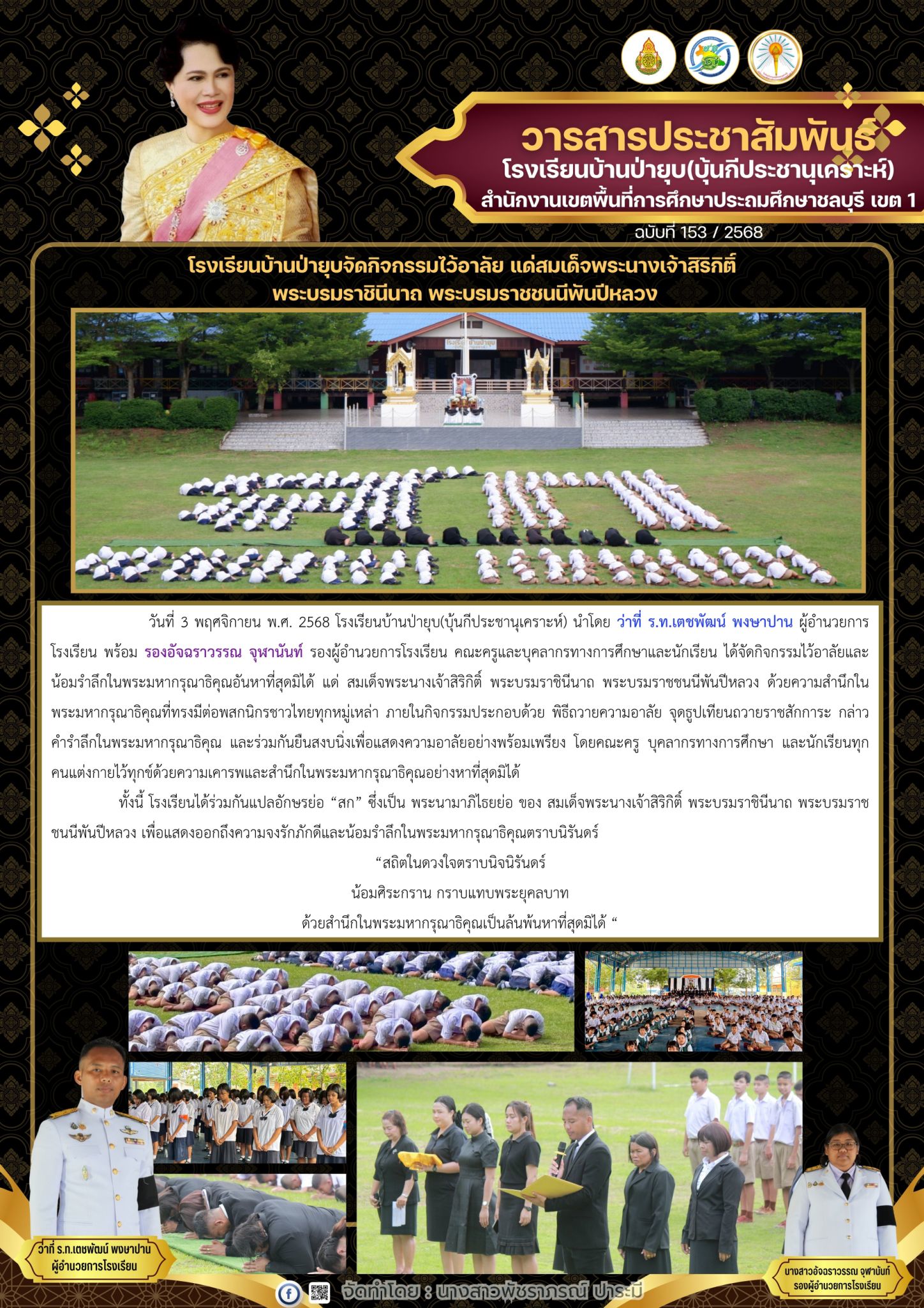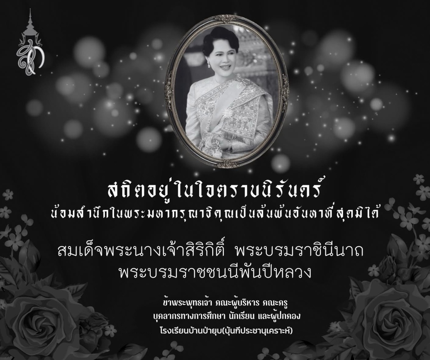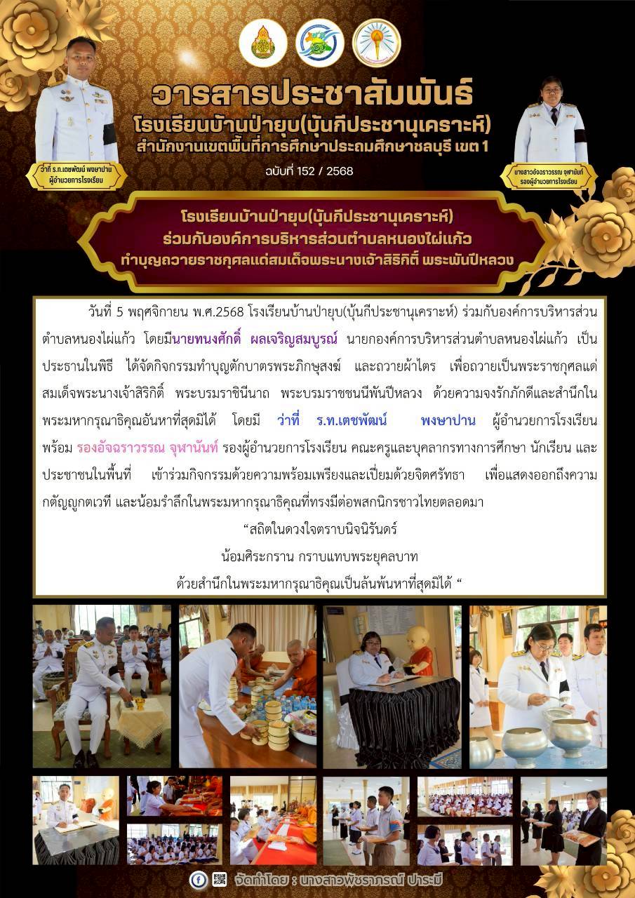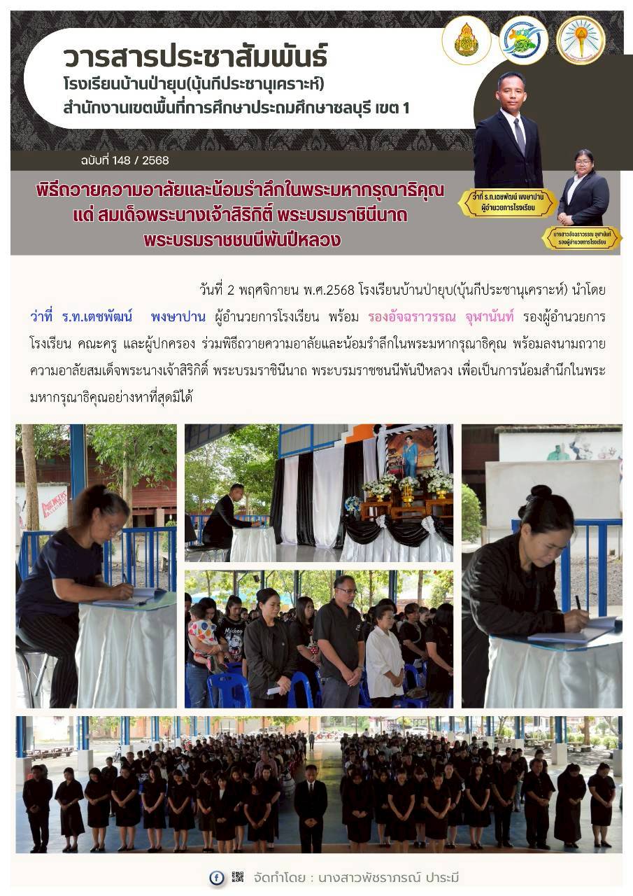 วันที่ 3 พฤศจิกายน พ.ศ. 2568 โรงเรียนบ้านป่ายุบ(บุ้นกีประชานุเคราะห์) นำโดย ว่าที่……ได้จัดกิจกรรม ไว้อาลัยและน้อมรำลึกในพระมหากรุณาธิคุณอันหาที่สุดมิได้ แด่ สมเด็จพระนางเจ้าสิริกิติ์ พระบรมราชินีนาถ พระบรมราชชนนีพันปีหลวง ด้วยความสำนึกในพระมหากรุณาธิคุณที่ทรงมีต่อพสกนิกรชาวไทยทุกหมู่เหล่า