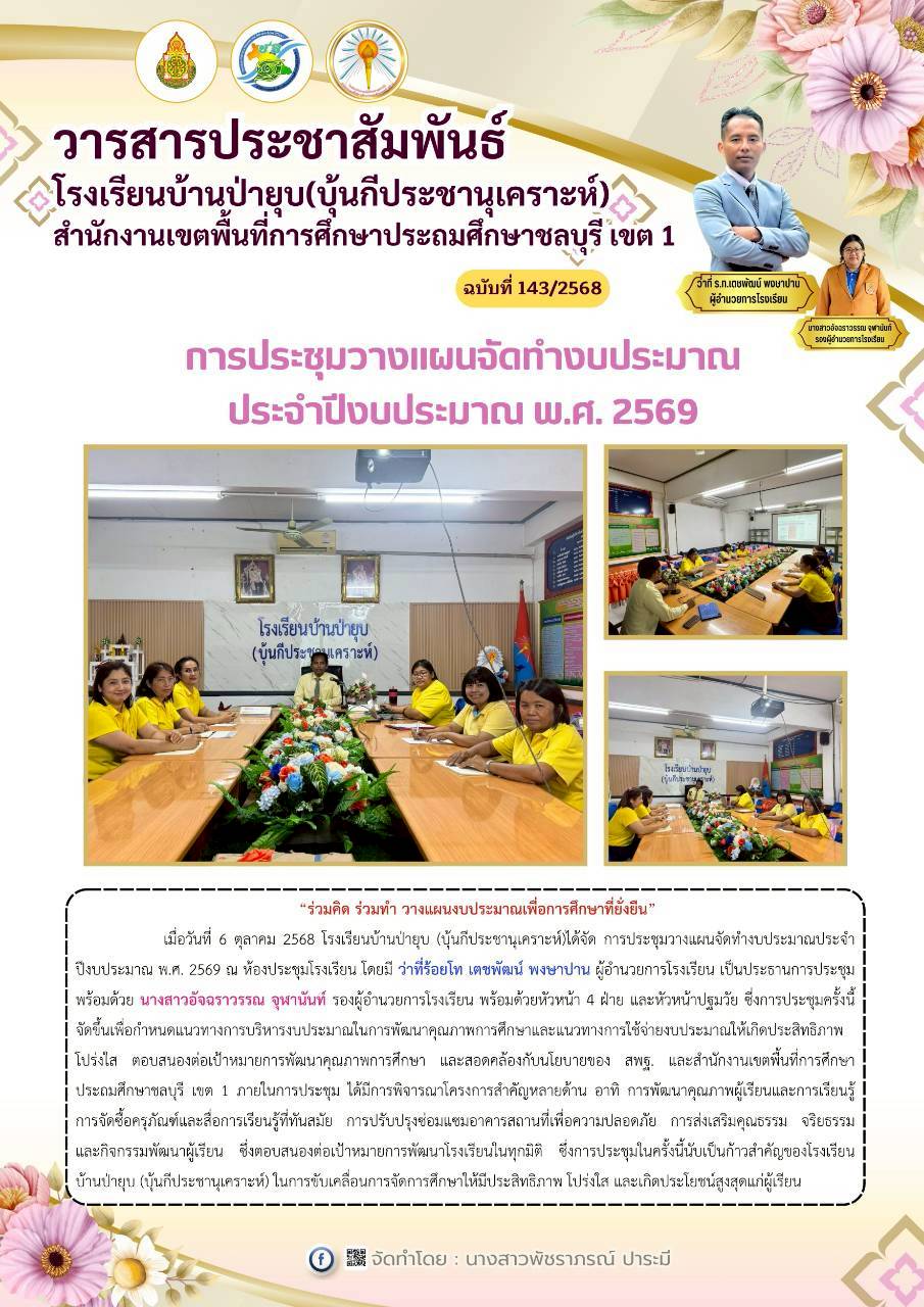 นายสุวัฒน์ เจนจิรวัฒนา ประธานกรรมการสถานศึกษาโรงเรียนบ้านป่ายุบ (บุ้นกีประชานุเคราะห์) เป็นประธานในการประชุมคณะกรรมการสถานศึกษา ประจำภาคเรียนที่ 2/2568 เพื่อพิจารณาการจัดสรรงบประมาณประจำปี 2569 สำหรับการจัดทำแผนปฏิบัติการประจำปี 2569 พร้อมทั้งร่วมประชุมวางแผนการจัดกิจกรรม วันเด็กแห่งชาติ ประจำปี 2569