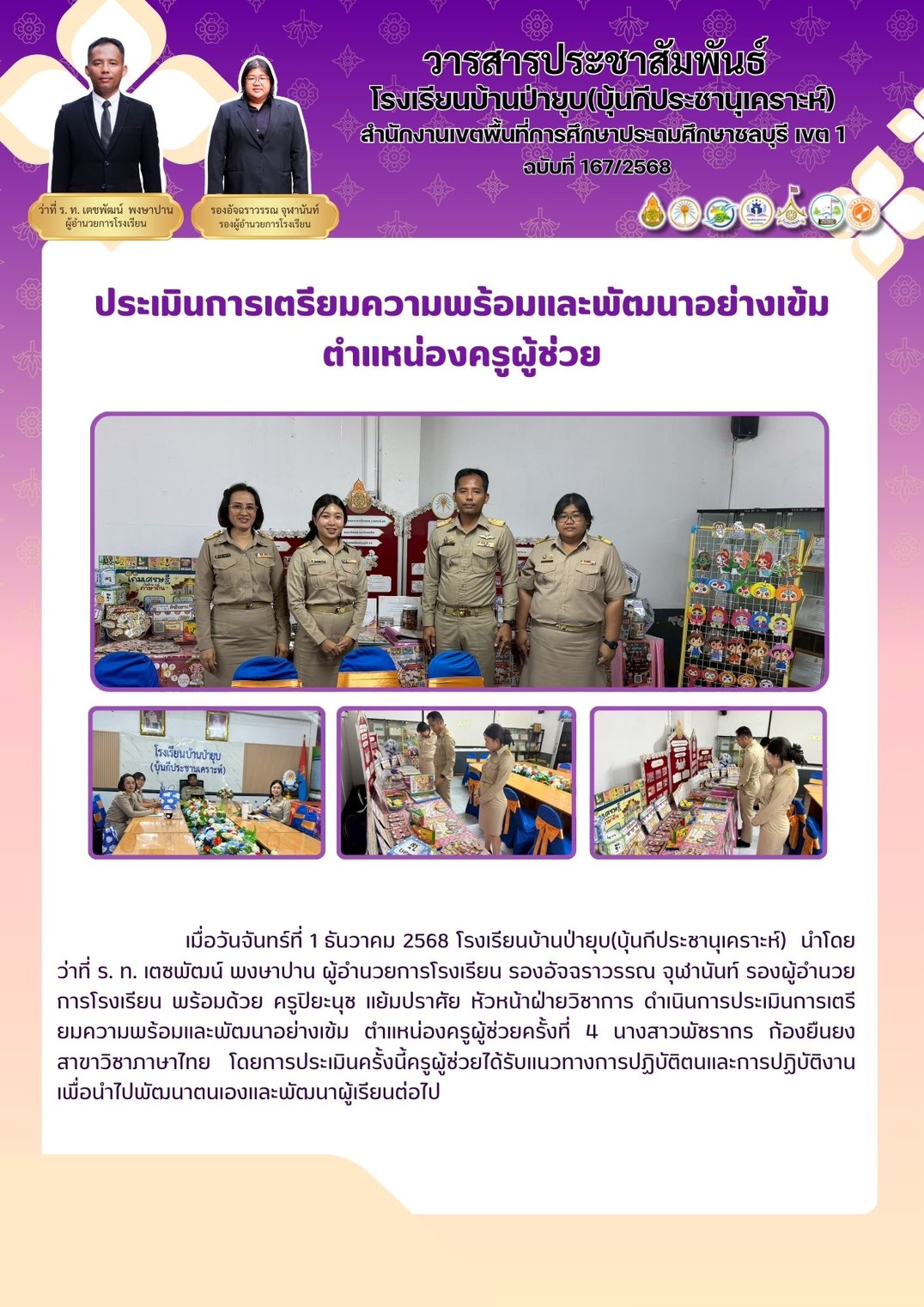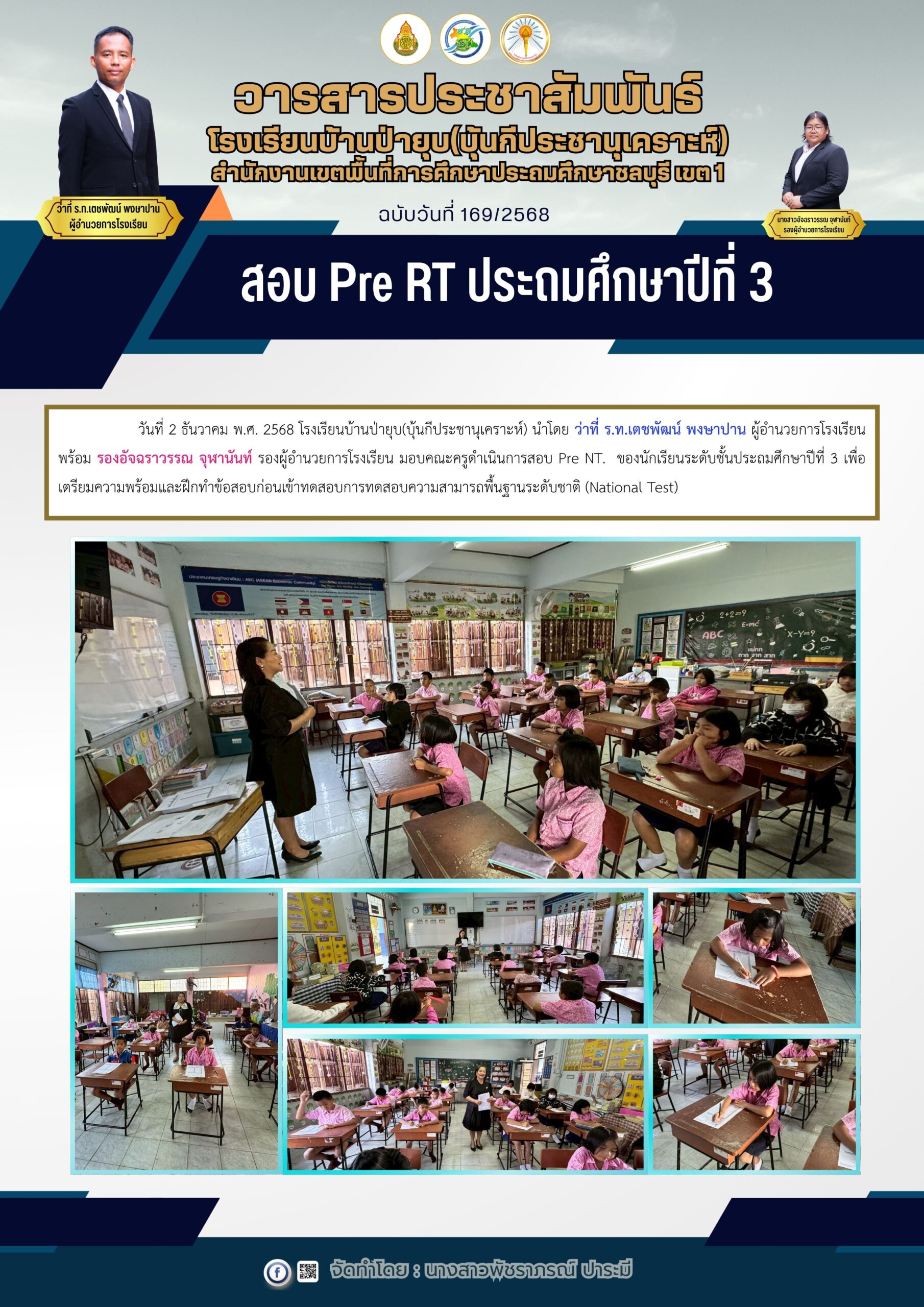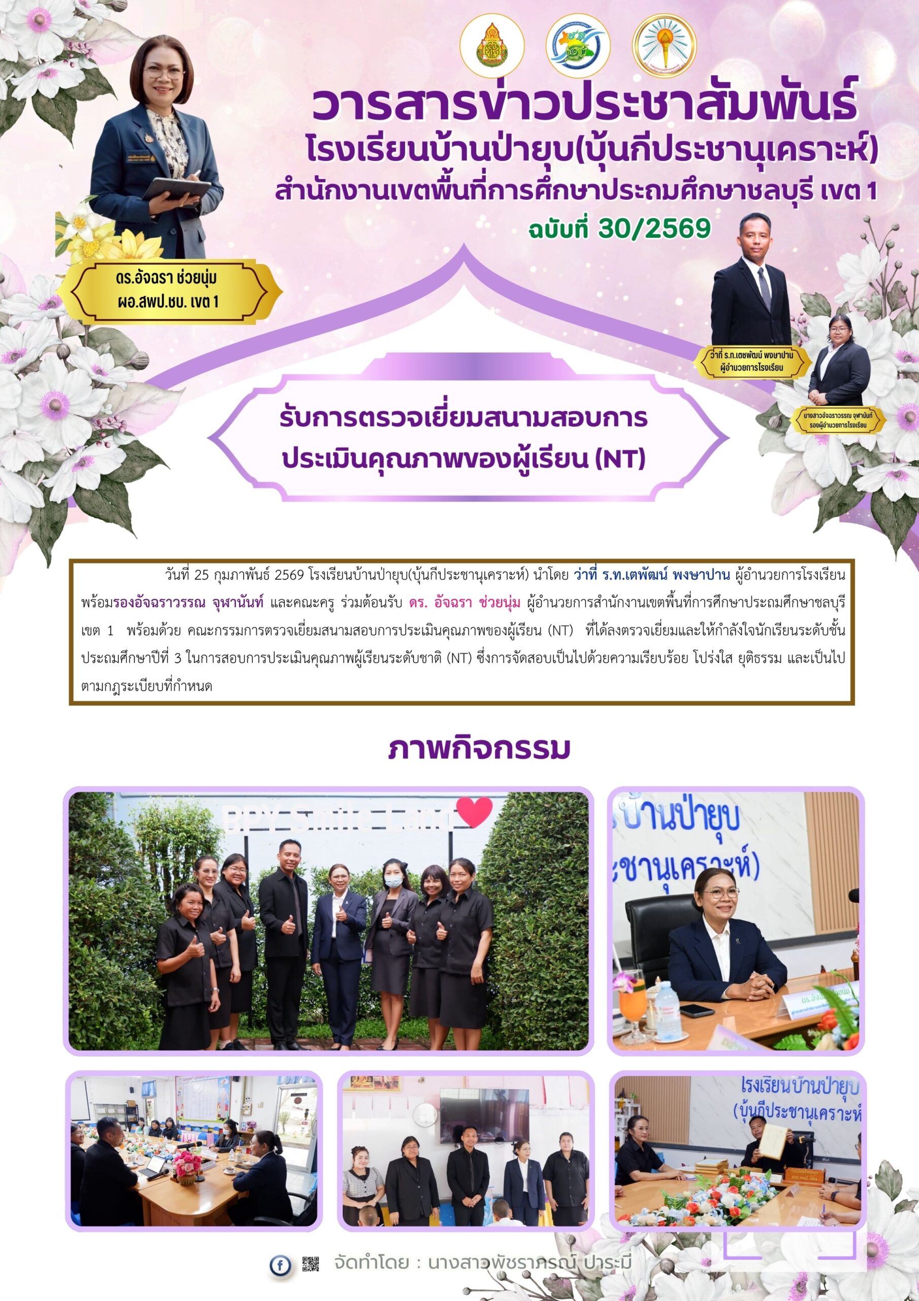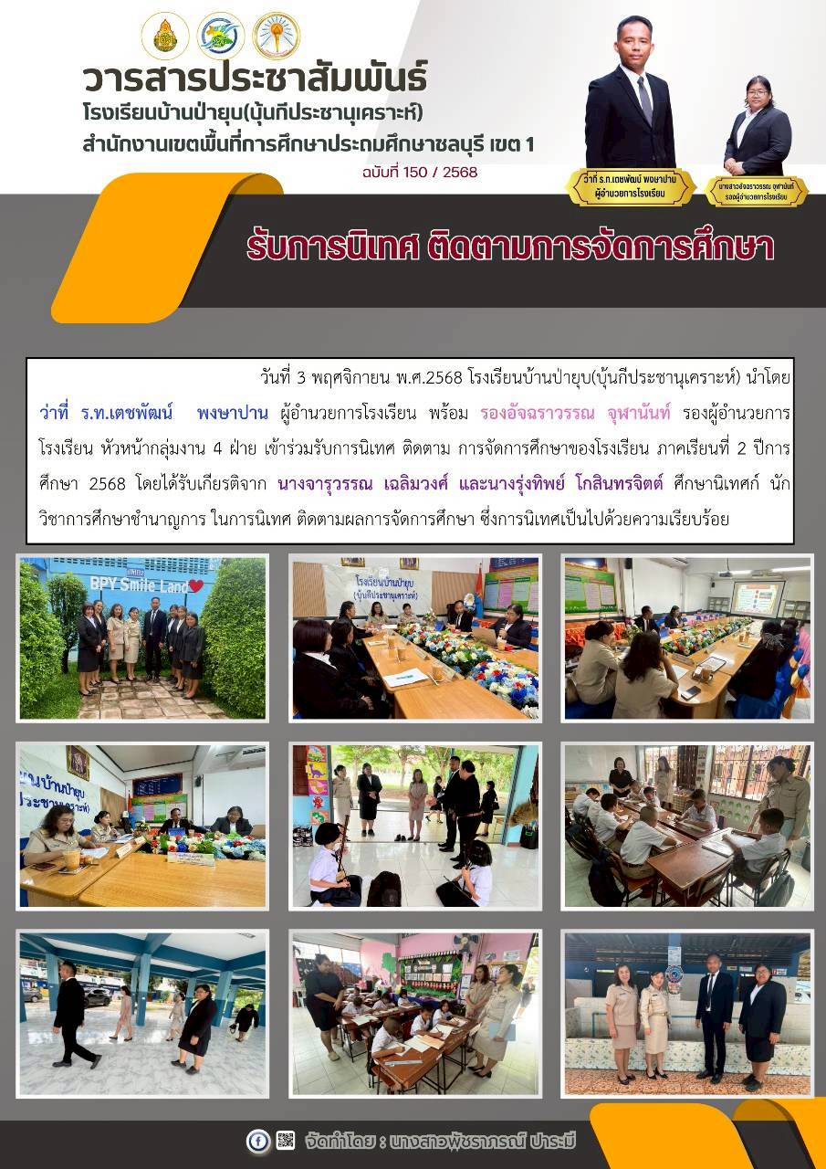 วันที่ 25 กุมภาพันธ์ 2569 ดร.อัจฉรา ช่วยนุ่ม ผู้อำนวยการสำนักงานเขตพื้นที่การศึกษาประถมศึกษาชลบุรี เขต 1 ลงพื้นที่ตรวจเยี่ยมสนามสอบการประเมินคุณภาพผู้เรียน (National Test: NT) ของนักเรียนระดับชั้นประถมศึกษาปีที่ 3 ณ โรงเรียนบ้านป่ายุบ (บุ้นกีประชานุเคราะห์) โดยมี ว่าที่ ร.ท. เตชพัฒน์ พงษาปาน ผู้อำนวยการโรงเรียนบ้านป่ายุบ (บุ้นกีประชานุเคราะห์) และ น.ส.อัจฉราวรรณ จุฬานันท์ รองผู้อำนวยการโรงเรียนบ้านป่ายุบ พร้อมด้วยหัวหน้า 4 ฝ่าย ให้การต้อนรับในการลงพื้นที่ตรวจเยี่ยมสนามสอบ
