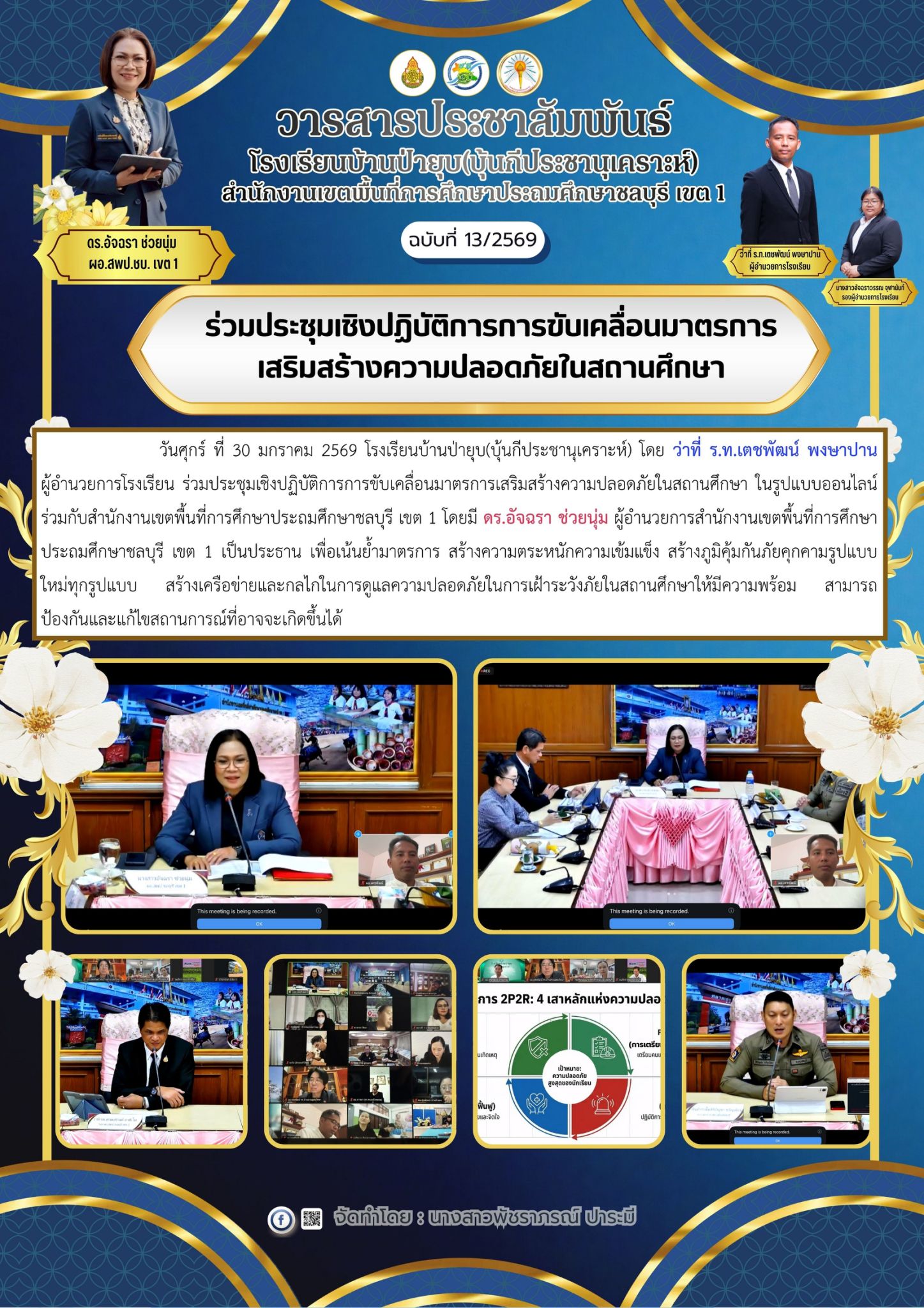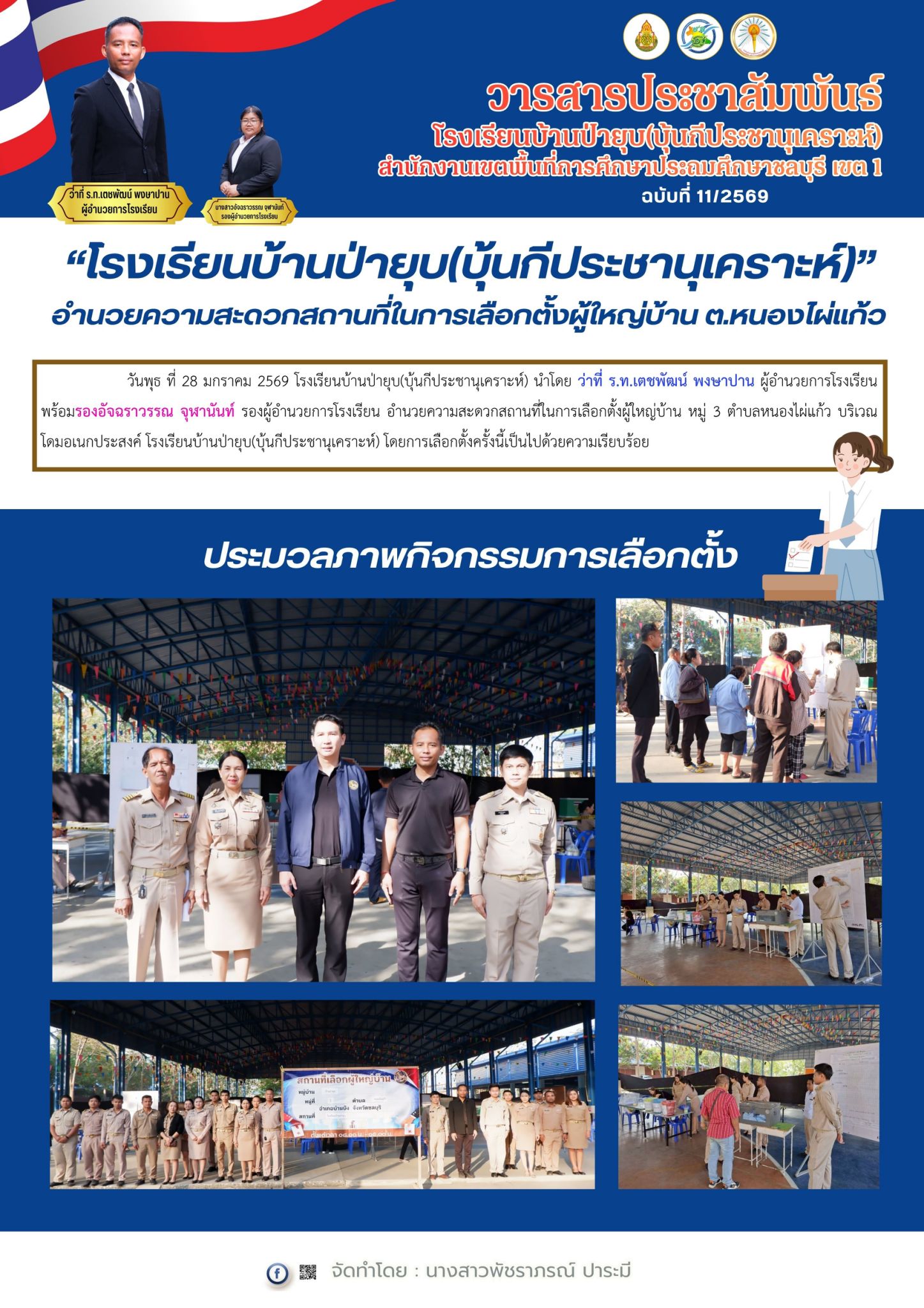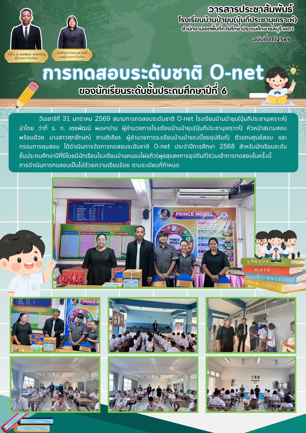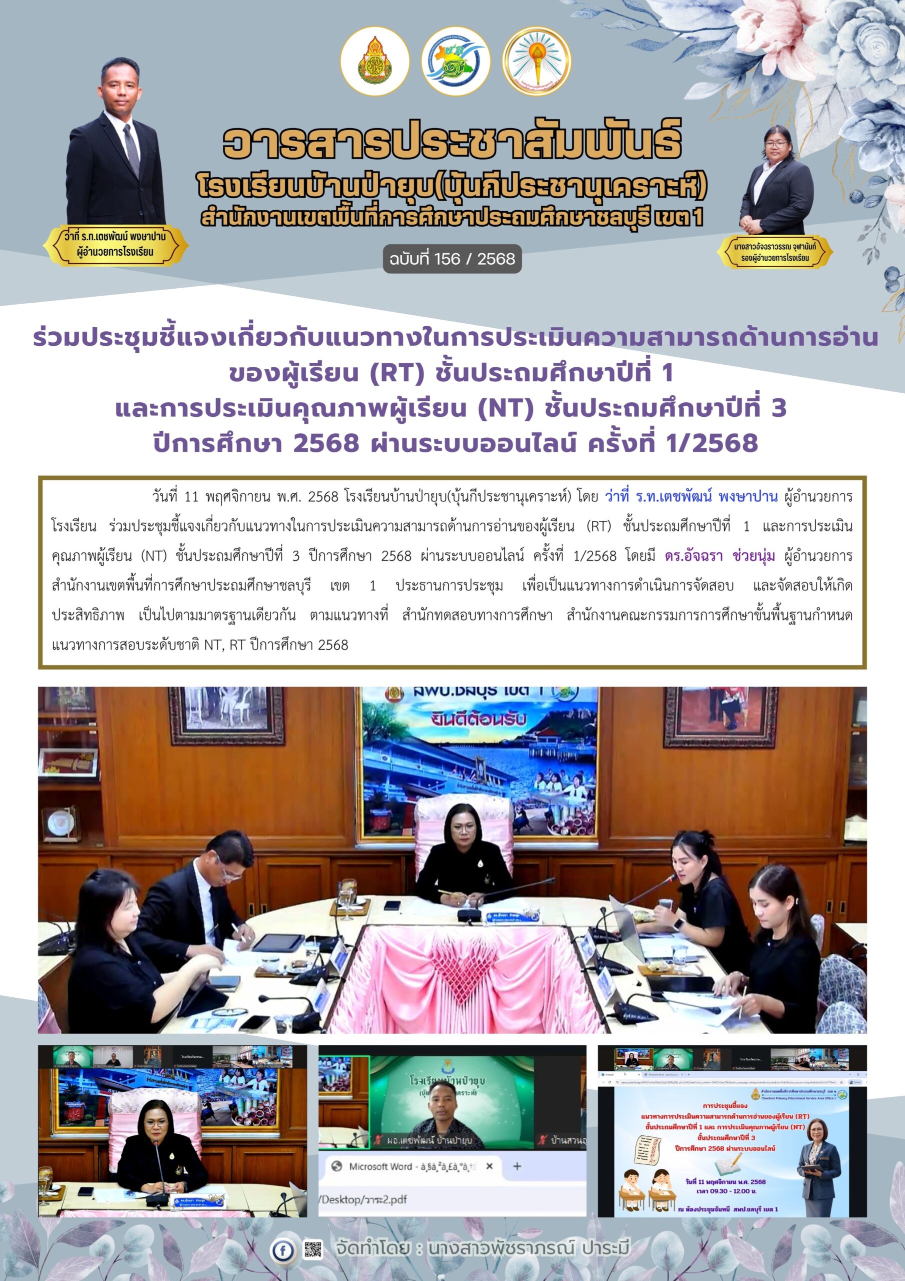 วันที่ 25 กุมภาพันธ์ 2569 ดร.อัจฉรา ช่วยนุ่ม ผู้อำนวยการสำนักงานเขตพื้นที่การศึกษาประถมศึกษาชลบุรี เขต 1 ลงพื้นที่ตรวจเยี่ยมสนามสอบการประเมินคุณภาพผู้เรียน (National Test: NT) ของนักเรียนระดับชั้นประถมศึกษาปีที่ 3 ณ โรงเรียนบ้านป่ายุบ (บุ้นกีประชานุเคราะห์) โดยมี ว่าที่ ร.ท. เตชพัฒน์ พงษาปาน ผู้อำนวยการโรงเรียนบ้านป่ายุบ (บุ้นกีประชานุเคราะห์) และ น.ส.อัจฉราวรรณ จุฬานันท์ รองผู้อำนวยการโรงเรียนบ้านป่ายุบ พร้อมด้วยหัวหน้า 4 ฝ่าย ให้การต้อนรับในการลงพื้นที่ตรวจเยี่ยมสนามสอบ