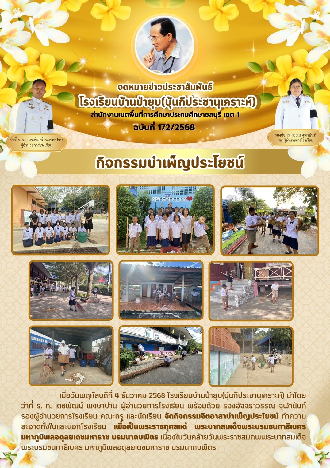 โรงเรียนบ้านป่ายุบ (บุ้นกีประชานุเคราะห์) ขอกราบขอบพระคุณ บริษัท ฟาร์มกรุงไทย จำกัด เป็นอย่างสูง ที่ได้ให้ความอนุเคราะห์สนับสนุนทั้งด้านบุคลากรที่มีความเชี่ยวชาญ และวัสดุอุปกรณ์ในการดำเนินงานปรับปรุงภูมิทัศน์และสร้างความปลอดภัย เมื่อวันที่ ๒๔ – ๒๕ มกราคม ๒๕๖๙ ที่ผ่านมา