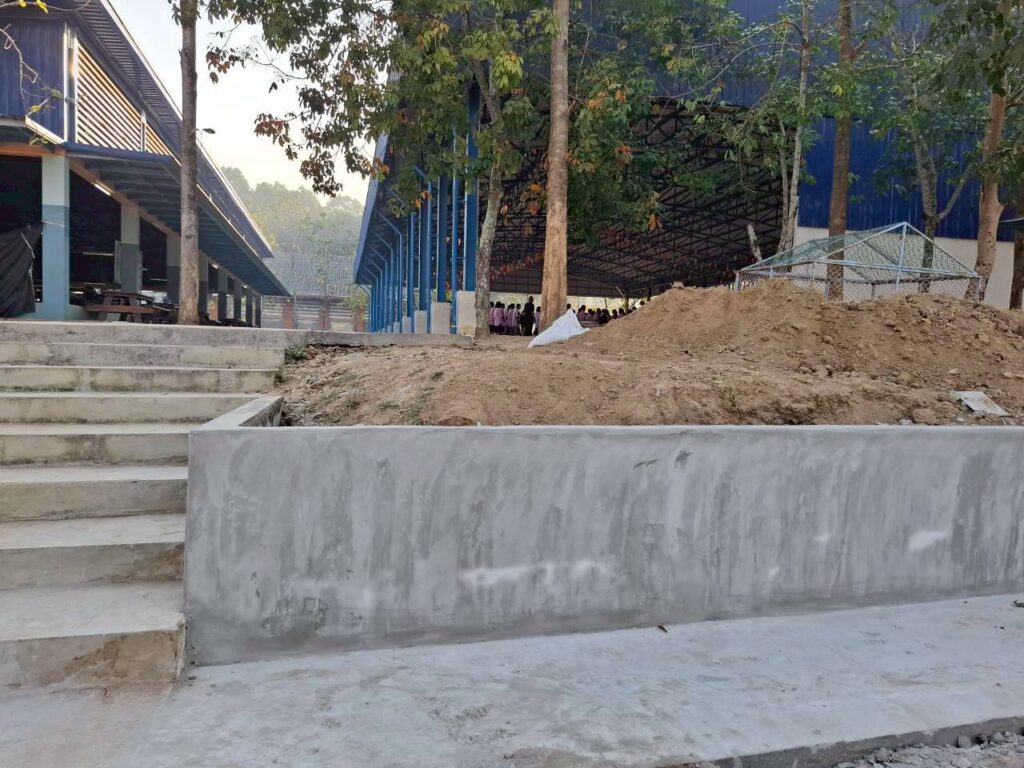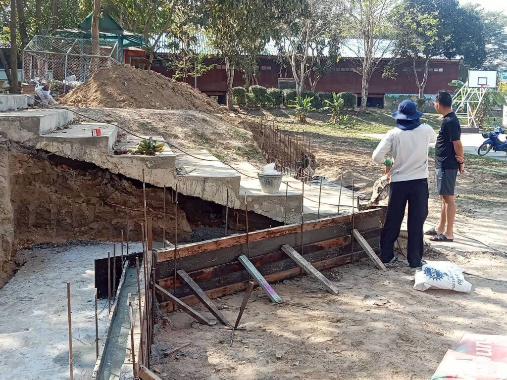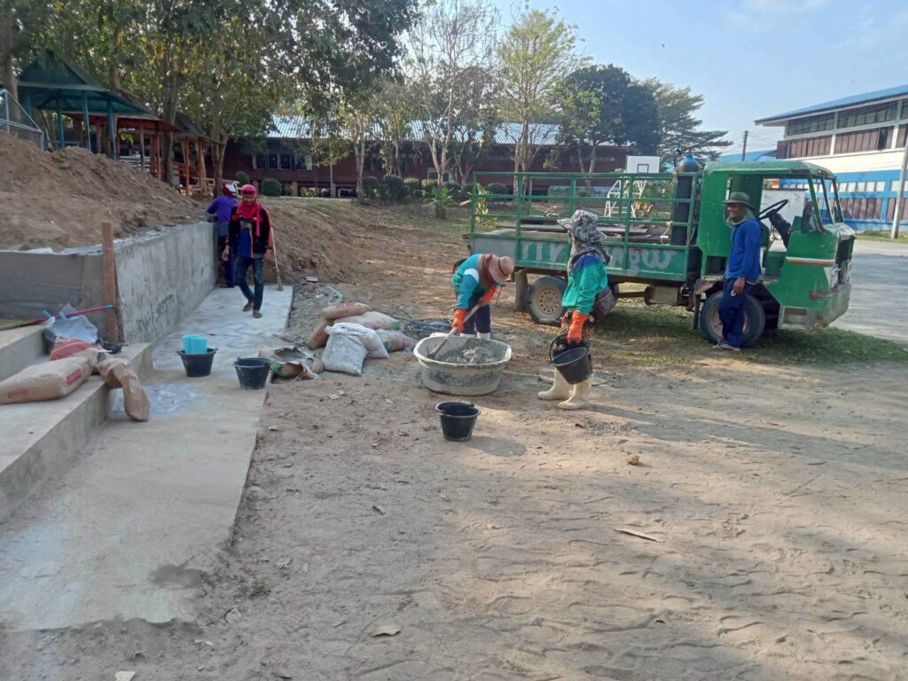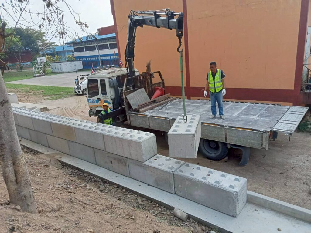 โดยทางบริษัทฯ ได้เข้ามาดำเนินการจัดทำ “พื้นเทริน” เพื่อใช้เป็นฐานรากที่มีความมั่นคงแข็งแรงสำหรับการวางเลโก้บล็อกคอนกรีต พร้อมทั้งดำเนินการ “จัดทำคันฟุตบาท” เพื่อความเป็นระเบียบเรียบร้อยและความปลอดภัยในการสัญจรของนักเรียน