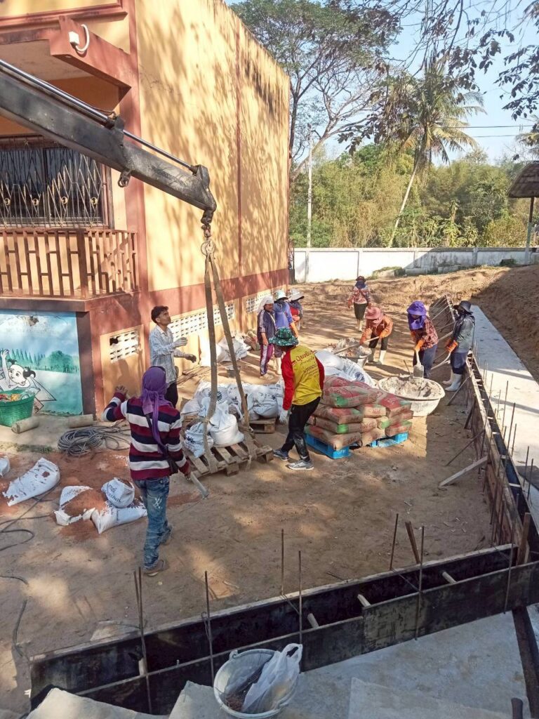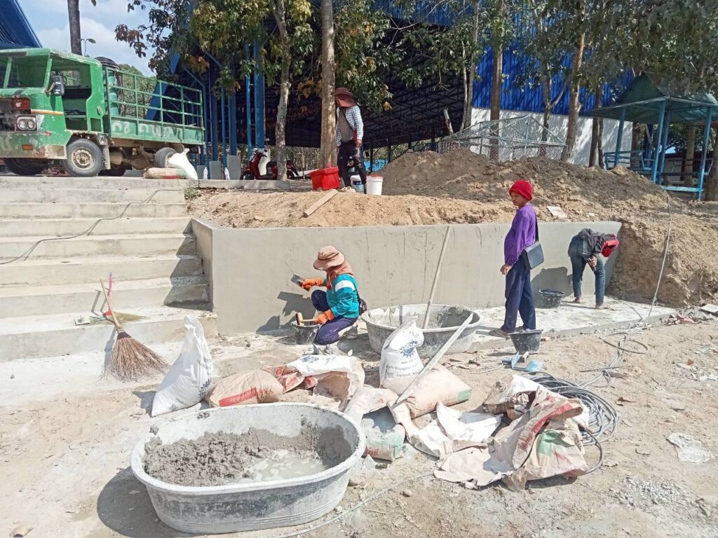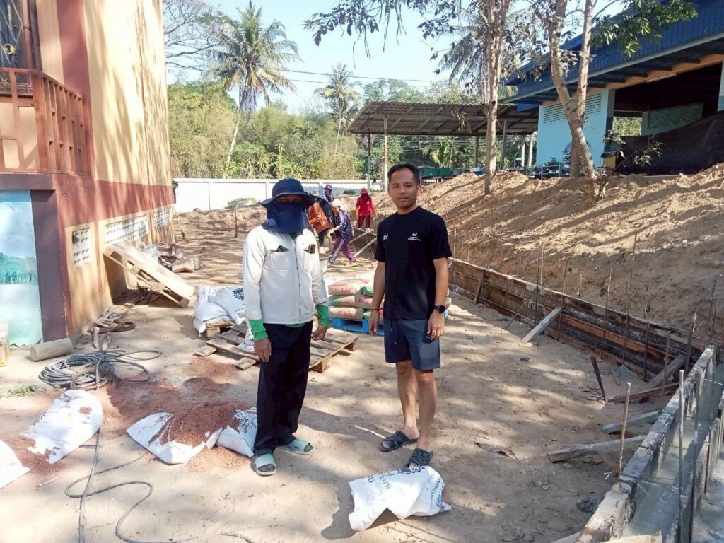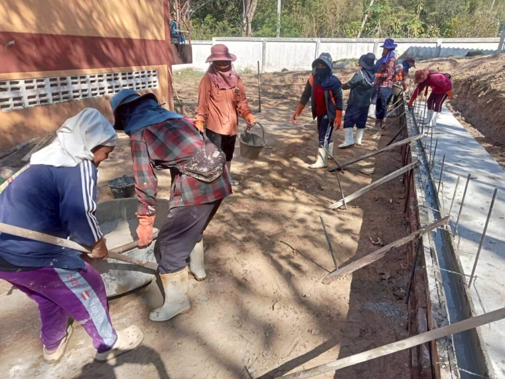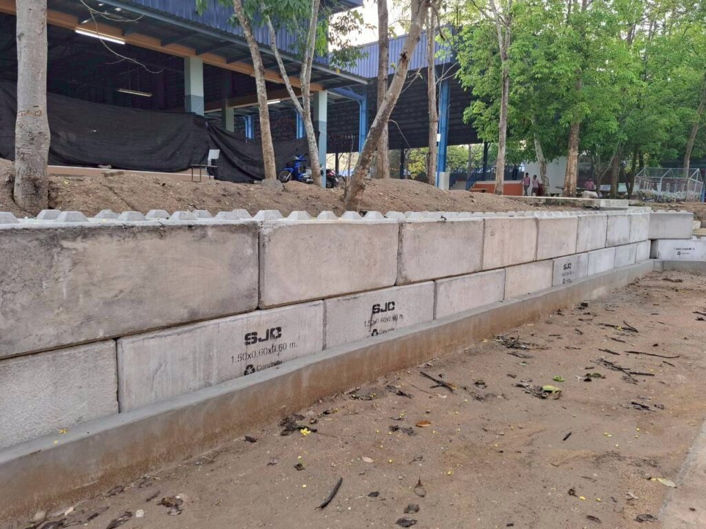 โดยทางบริษัทฯ ได้เข้ามาดำเนินการจัดทำ “พื้นเทริน” เพื่อใช้เป็นฐานรากที่มีความมั่นคงแข็งแรงสำหรับการวางเลโก้บล็อกคอนกรีต พร้อมทั้งดำเนินการ “จัดทำคันฟุตบาท” เพื่อความเป็นระเบียบเรียบร้อยและความปลอดภัยในการสัญจรของนักเรียน